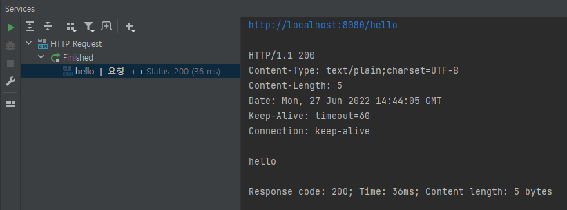 hello.http 파일에 해당 내용을 적고 좌측의 실행버튼을 눌러보면
