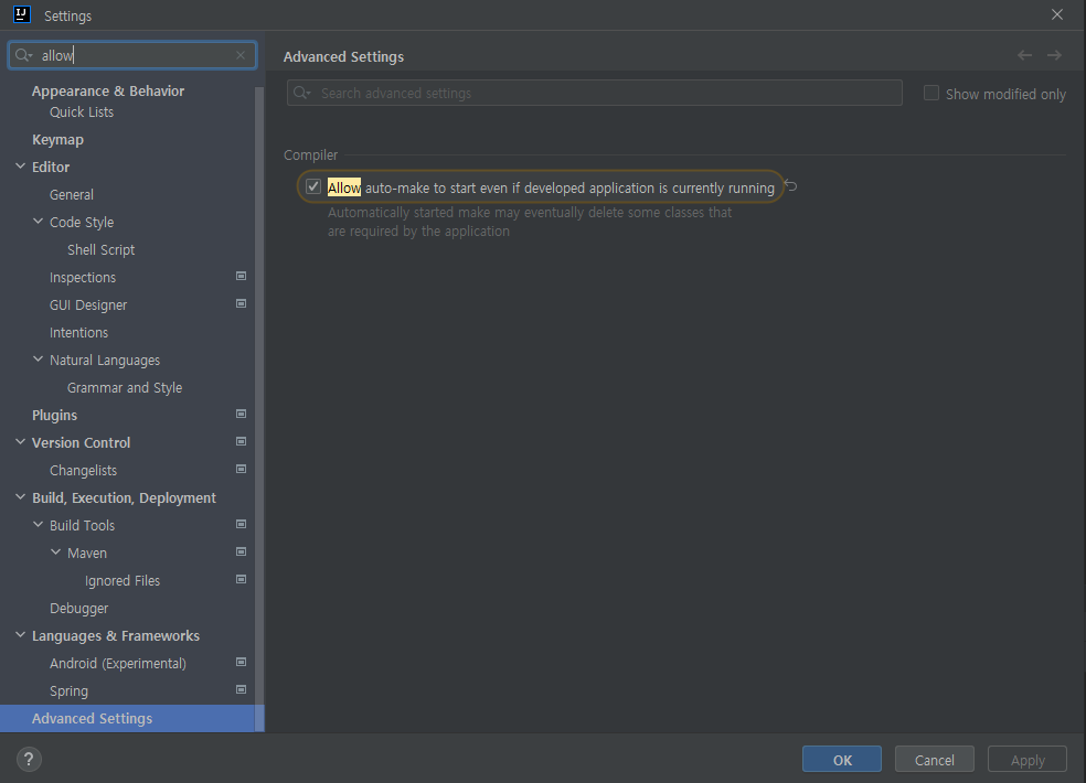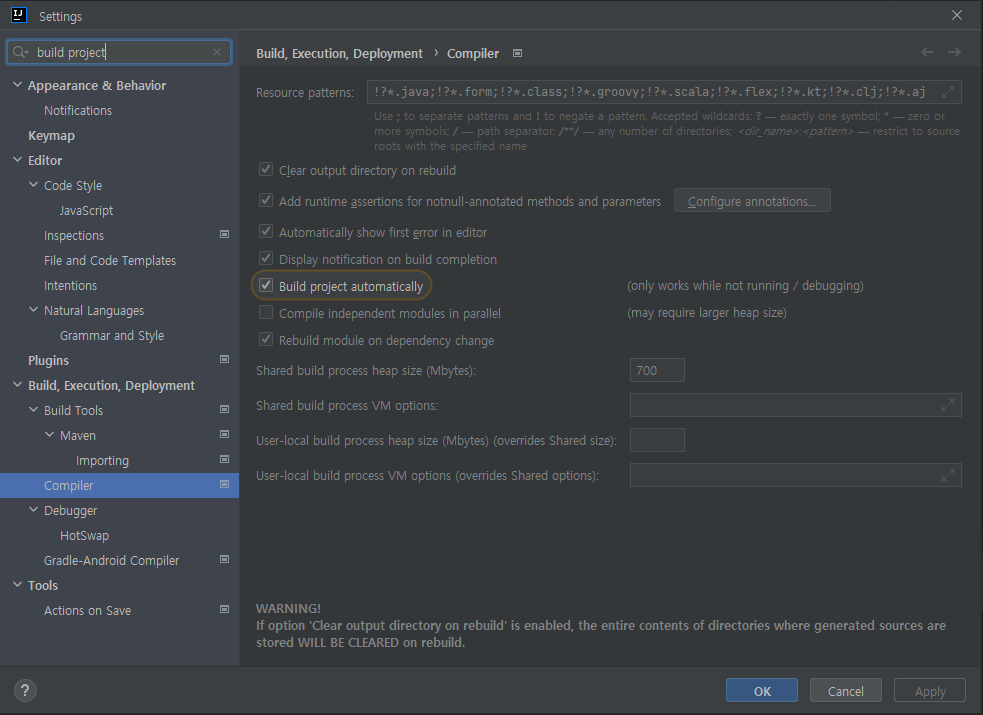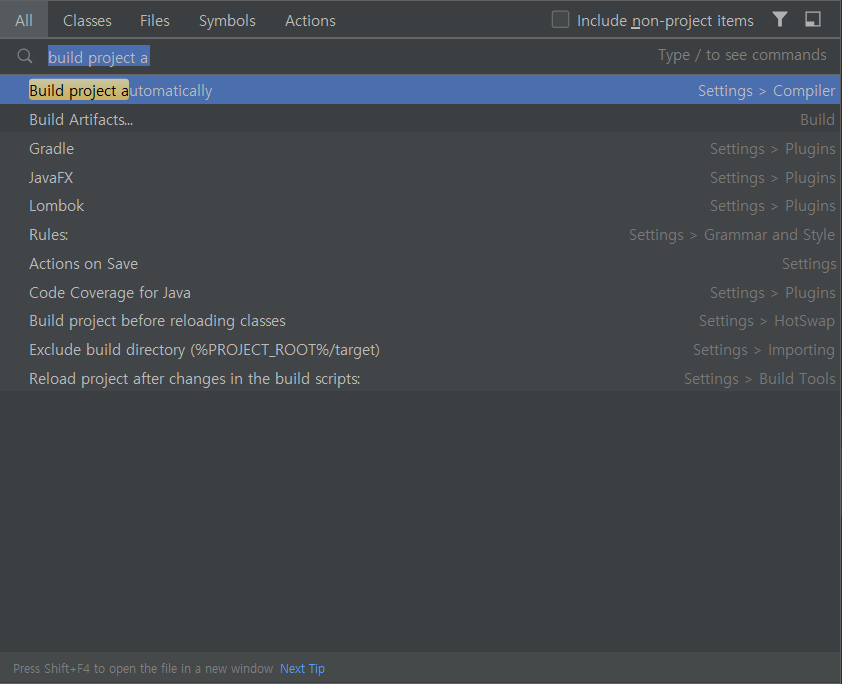 저거 따라가기 귀찮으니 쉬프트 2번누르면 검색기능이 활성화되는데 그곳에 build project automatically 검색하면 바로뜸