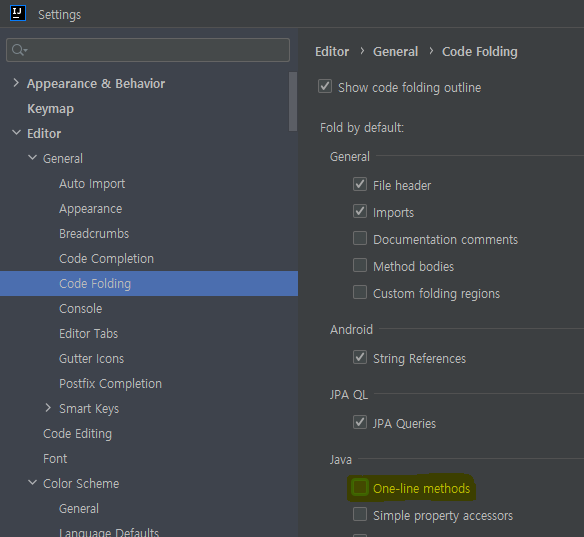 Setting > Editor > General > Code Folding > One-line methods 체크 해제